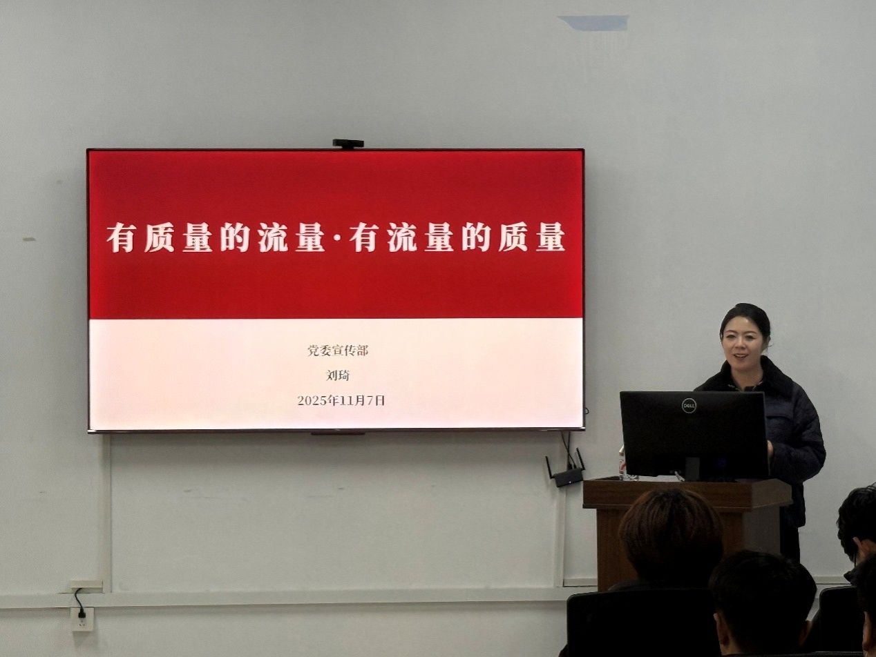 学院特邀学校党委宣传部刘琦老师开展《有质量的流量 有流量的质量》专题培训。培训中,刘琦老师围绕新闻宣传的核心逻辑展开分享,从新闻的定义与特点切入,解析了不同类型新闻稿的写作结构,强调标题需具谓词性、正文要突出亮点、背景需以事实阐释。同时,她重点讲解了旗帜徽章准确使用、新闻图片规范选取的细节要求,还介绍了多款AI工具在宣传工作中的应用场景,为学生干部提升宣传效能提供了多元思路。