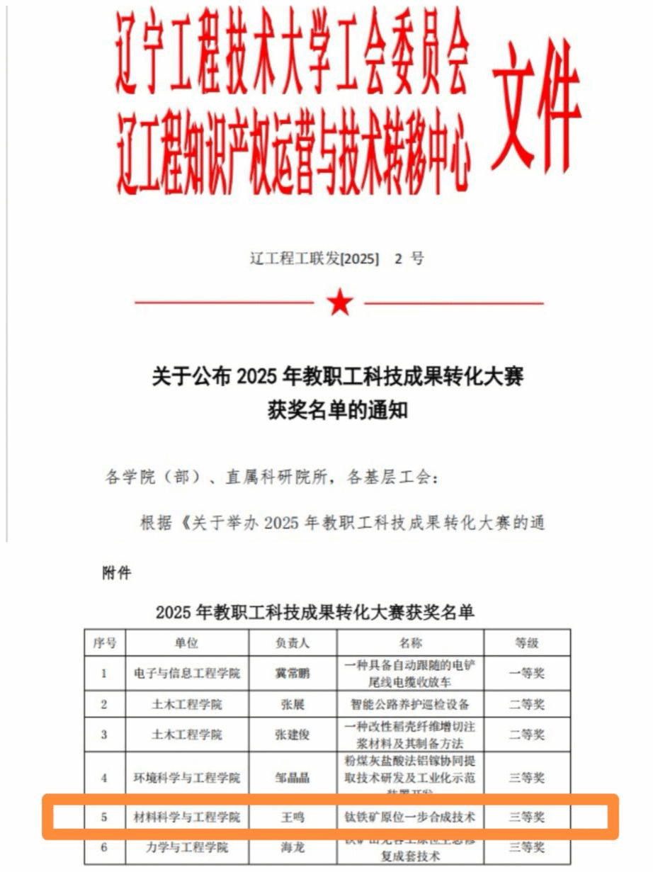 近日,在2025年辽宁工程技术大学教职工科技成果转化大赛中,我院教师王鸣副教授凭借《钛铁矿原位一步合成钛酸锂技术》项目脱颖而出,斩获三等奖。此次获奖既是对王鸣副教授近年来科研工作的高度认可,也彰显了学院在推动科研成果转化方面的显著成效。