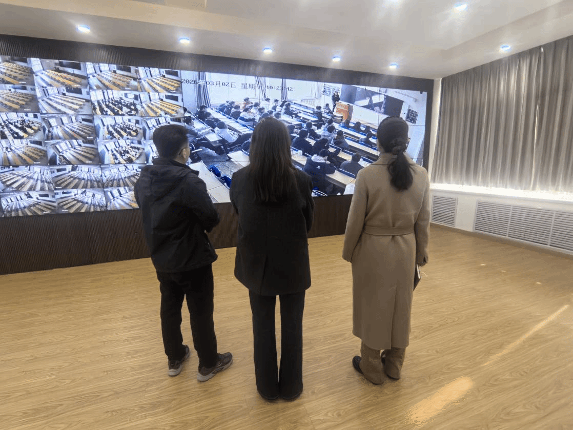 随后,学院领导班子前往新华楼监控室开展集中看课,通过实时监控全面察看各课堂教师授课状态、教学组织流程、学生到课率、课堂听讲专注度及学风表现,细致掌握新学期课堂教学与学生学习状态的情况,确保教学秩序规范、学风建设扎实有效。