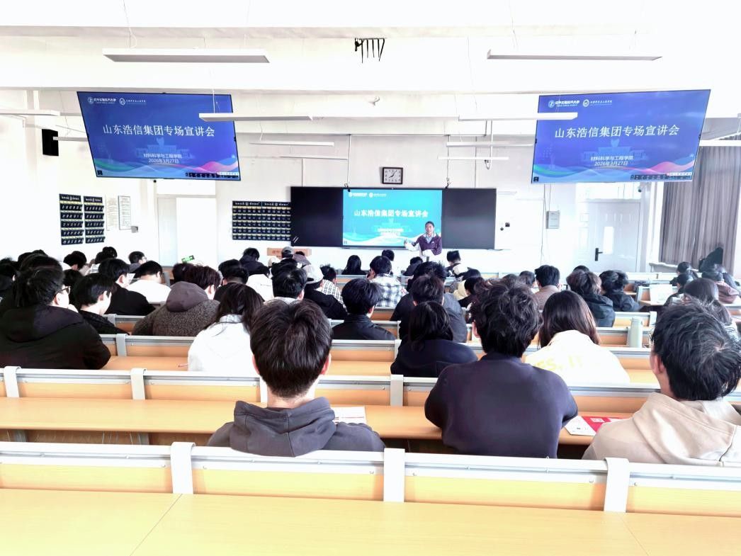 座谈结束后,孙总针对材料科学与工程学院、机械工程学院2026届毕业生进行企业专场宣讲及招聘面试。宣讲会上,孙总通过企业宣传片、PPT 讲解、案例分享等形式,向同学们全面介绍了浩信集团的发展历程、企业文化、岗位需求、薪资待遇、晋升通道等内容,并与在场毕业生进行互动交流,现场解答同学们的求职疑问。宣讲结束后,企业同步开展现场面试,对投递简历的毕业生进行一对一沟通考核,精准筛选适配人才,现场气氛热烈,毕业生踊跃参与、积极展现专业素养。